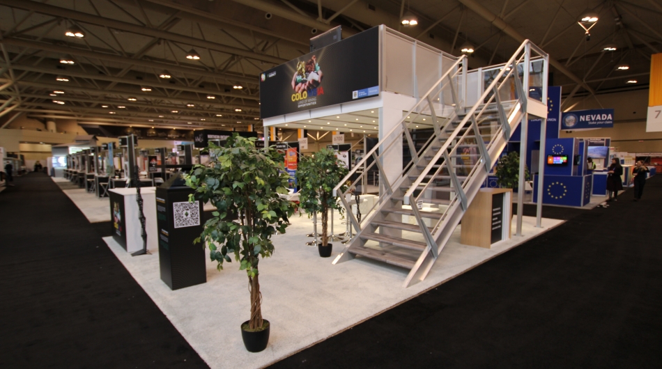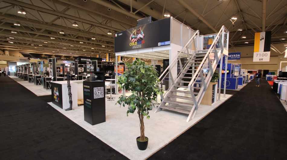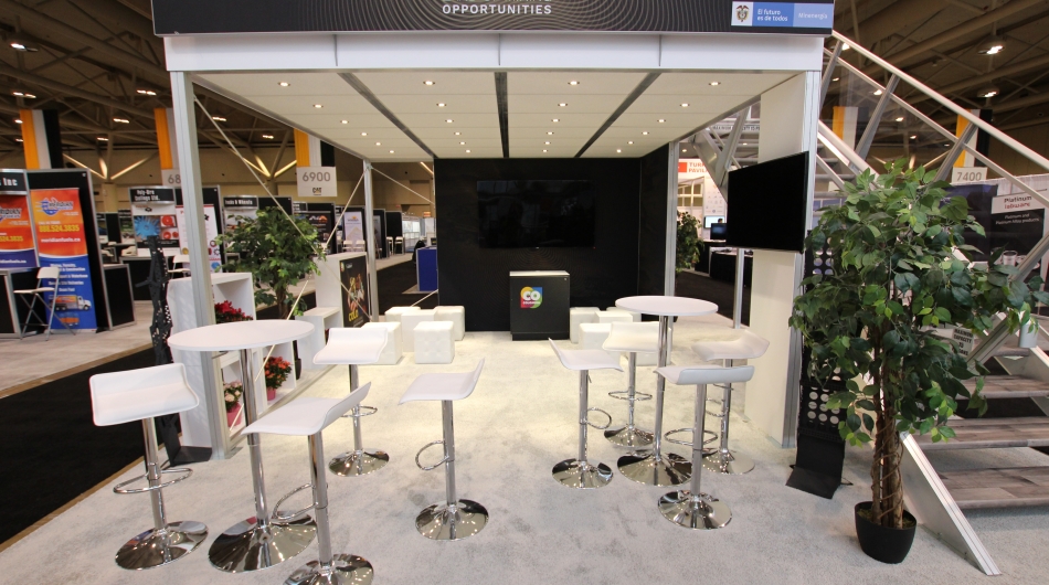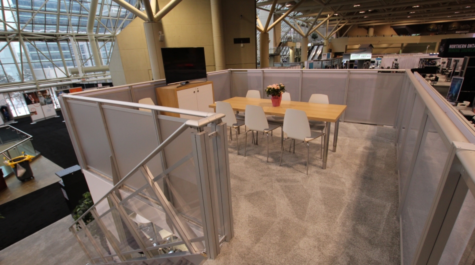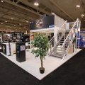 stevensE3 was asked to design a two-storey exhibit for this client within a fairly confined booth space as well as challenging restrictions imposed by the show that created significant obstacles for the design, construction and installation of this smaller two-storey booth. Open meeting space, large graphics, and an open concept approach were requested and these elements had to be integrated into stringent show regulations.